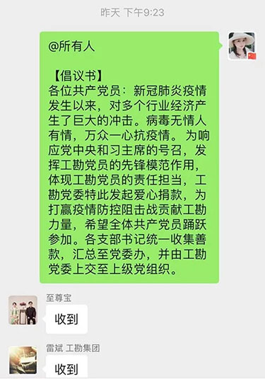 倡議一經(jīng)發(fā)出,工勘集團黨委委員及各支部書記第一時間發(fā)揮“頭雁”作用,帶頭捐款,廣大黨員積極響應(yīng),入黨積極分子和群眾也紛紛表示要向黨員學(xué)習(xí),為防疫工作貢獻出自己的一份力量。眾志成城齊戰(zhàn)“疫”,短短兩個小時,集團黨委就收集到愛心捐款38700元,用涓涓細流匯聚成齊心戰(zhàn)“疫”的愛心暖流。